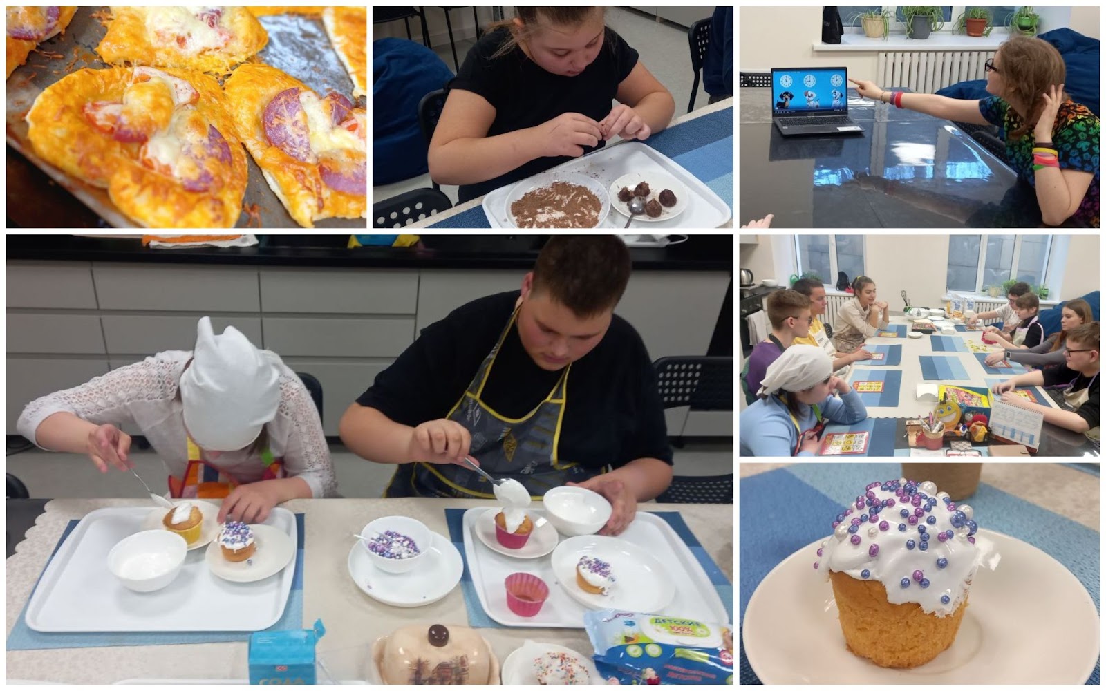 На занятиях по социально-бытовому ориентированию и в кулинарной мастерской было вкусно, весело и познавательно) Были и мини-пиццы, и конфетки, и куличики… всё такое ароматное! Конечно же, учились и распознавать время, и времена года, и кухонную утварь изучали… было очень полезно!: